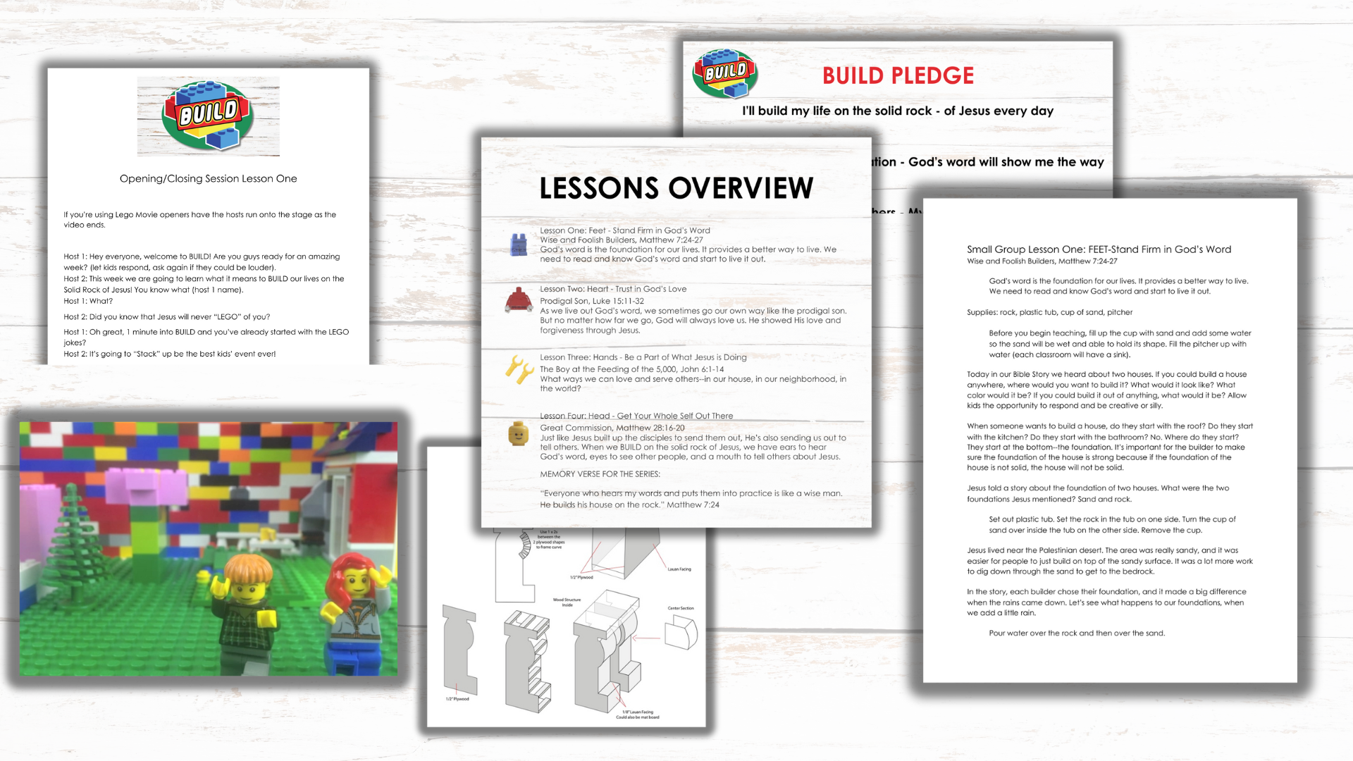 BUILD VBS is a 4-Day Planning Kit that contains all the essentials to create your own custom VBS, summer camp or other event. It uses a Lego theme to teach kids to BUILD their lives on the Solid Rock of Jesus. Each session, the Bible lesson will connect to a different part of a giant Lego man!
