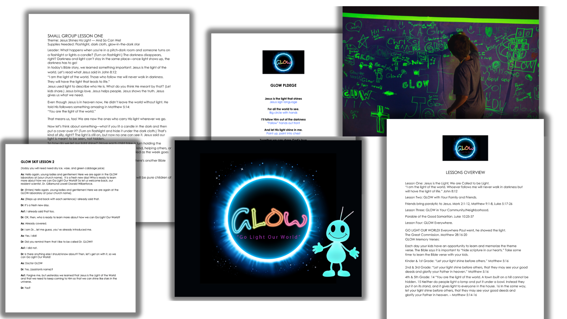GLOW (Go Light Our World) VBS is a 4-Day Planning Kit that contains the building blocks to help you create your own unique VBS, summer camp or other event based on Matthew 5:14-16 -- "You are the light of the world...In the same way, let your light shine before men, that they may see your good deeds and praise your Father in heaven."