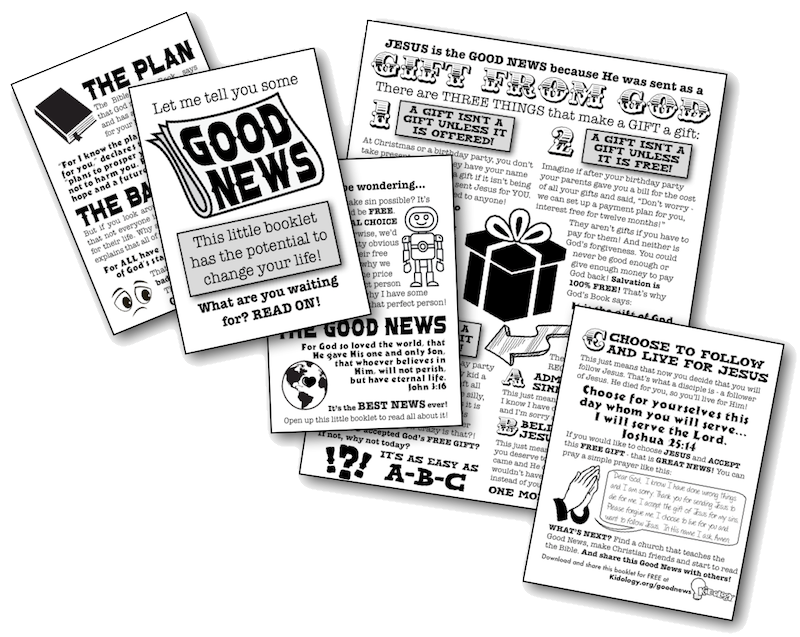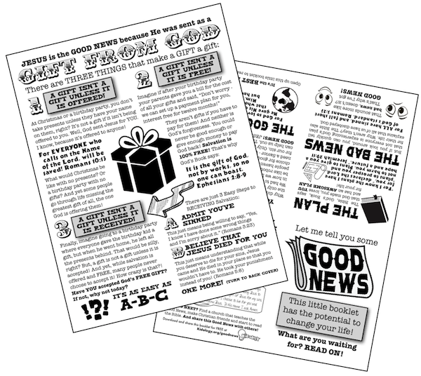 You can download the PDF of the GOOD NEWS GOSPEL TRACT below. Please print many copies and give them to people who need to hear this Good News! Provide them to children so they can share the Good News with their friends! Carry some with you so you are ready!