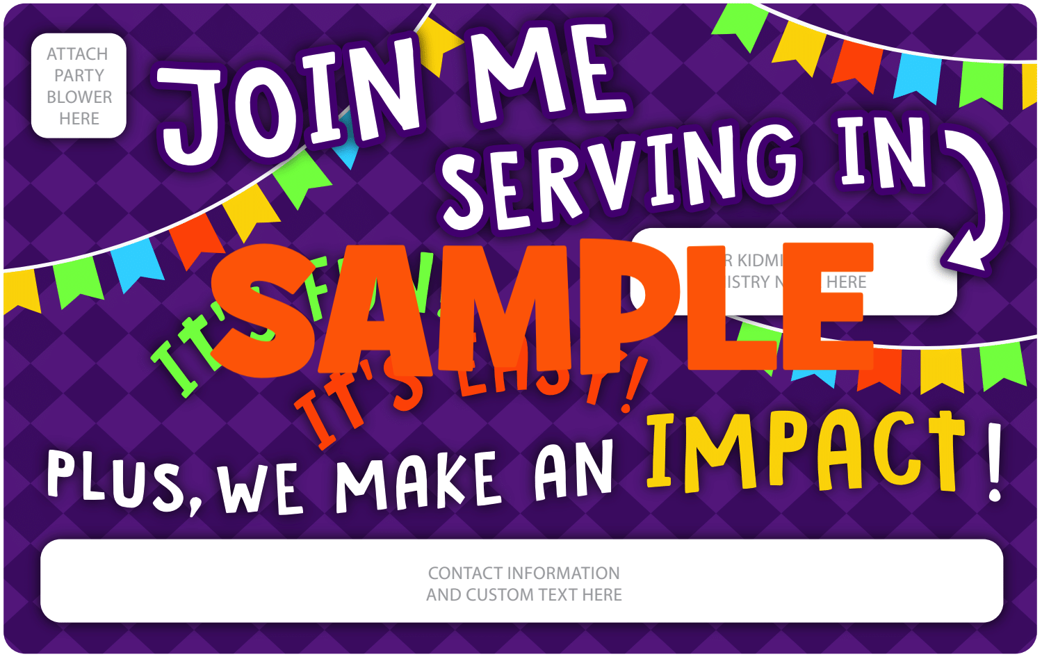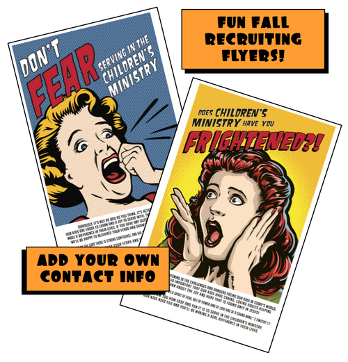 Recruiting is a never-ending job! That's why it's important to be fresh and original in how we approach prospective volunteers. The invitation to serve children must be creative and positive, but consistent! Let's face it, some people are afraid of serving with kids. These fun flyers encourage folks in a fun way to give it a try!