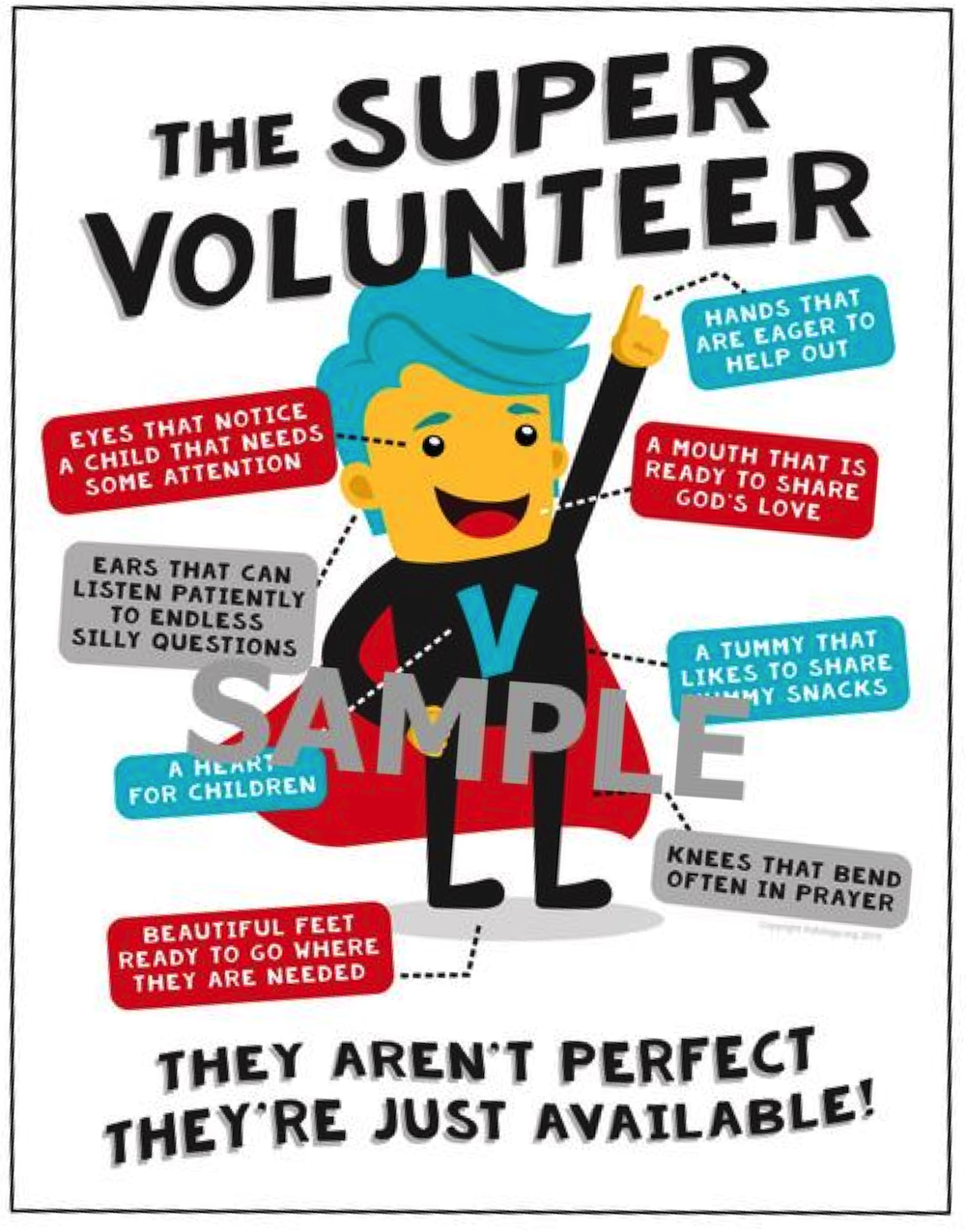 Recruiting is a never-ending job! That's why it's important to be fresh and original in how we approach prospective volunteers. The invitation to serve children must be creative and positive, but consistent! When you think of a Super Volunteer, what comes to mind? What traits would you like to see in your kidmin helpers? Hang this poster in your kids church room and start welcoming your new volunteers!